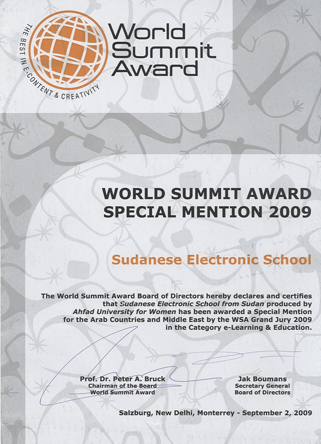 3مايو 2009:المدرسة الإلكترونية السودانية تفوز بجائزة(WSA) لأفضل محتوى إلكترونى إقليمى